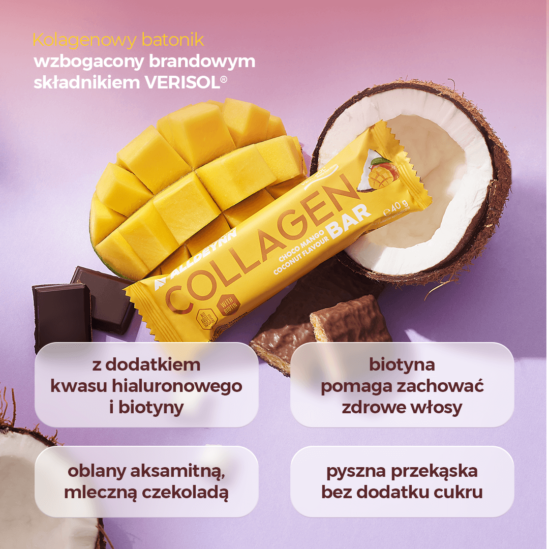 Połącz przyjemne z pożytecznym i sięgnij po ALLDEYNN COLLAGEN BAR – to wyjątkowy baton, który nie tylko zachwyca smakiem, ale również dba o pielęgnację skóry, włosów i paznokci dzięki zawartości Verisol® i biotyny. Formuła bez dodatku cukru, wzbogacona o kwas hialuronowy, sprawia, że możesz cieszyć się chwilą zapomnienia bez wyrzutów sumienia, dostarczając organizmowi cennych składników aktywnych w najwygodniejszej formie.