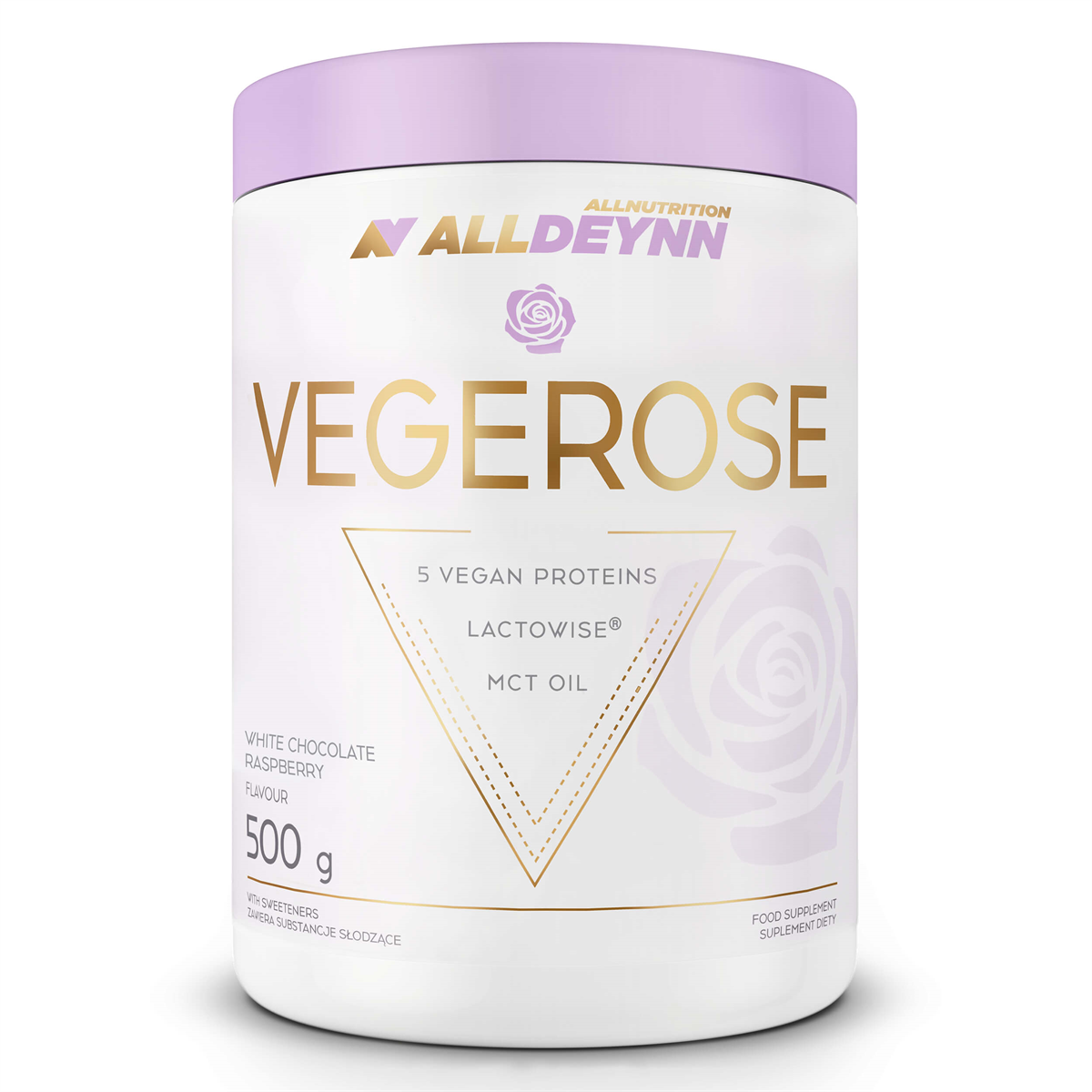 ALLDEYNN VEGEROSE to wysokobiałkowa odżywka do picia, oparta na premiksie pięciu białek roślinnych; izolacie białka grochu, koncentracie białka ryżowego, żurawinowego, migdałowego oraz białka konopnego. Wzbogacona została o brandowy kompleks probiotyczno-prebiotyczny LactoWise®, błonnik z akacji, siemię lniane oraz olej MCT.