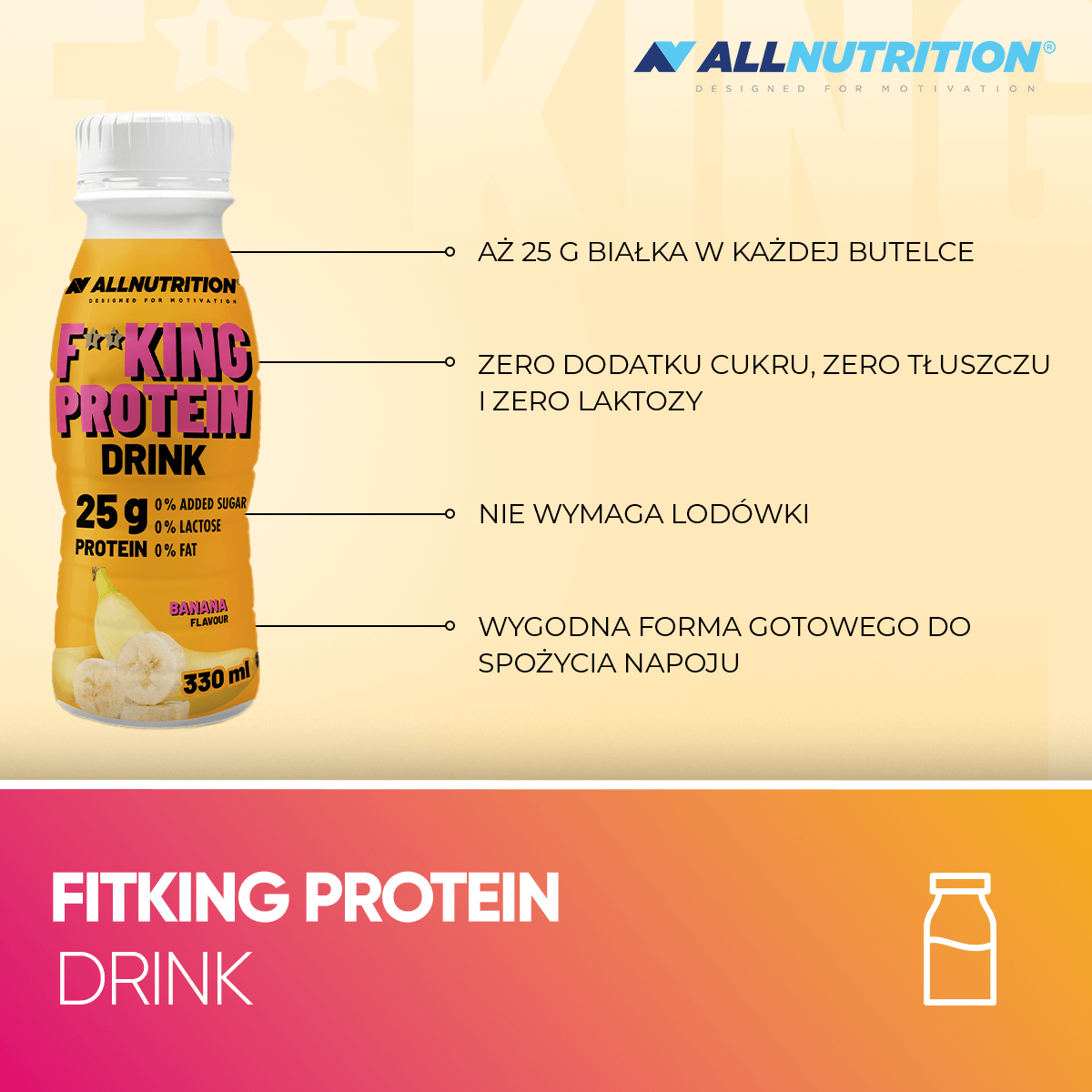 ALLNUTRITION FITKING PROTEIN DRINK to pyszny, wysokobiałkowy napój mleczny dostępny w dwóch wyjątkowych smakach – waniliowym i bananowym. Każda butelka dostarcza aż 25 g białka, a przy tym nie zawiera dodatku cukru, laktozy ani tłuszczu. To wygodna propozycja dla każdego, kto chce uzupełnić dietę w wartościowe składniki, niezależnie od trybu dnia. Świetnie sprawdza się w pracy, w biegu, po aktywności czy po prostu wtedy, gdy potrzebujesz czegoś szybkiego i pożywnego.