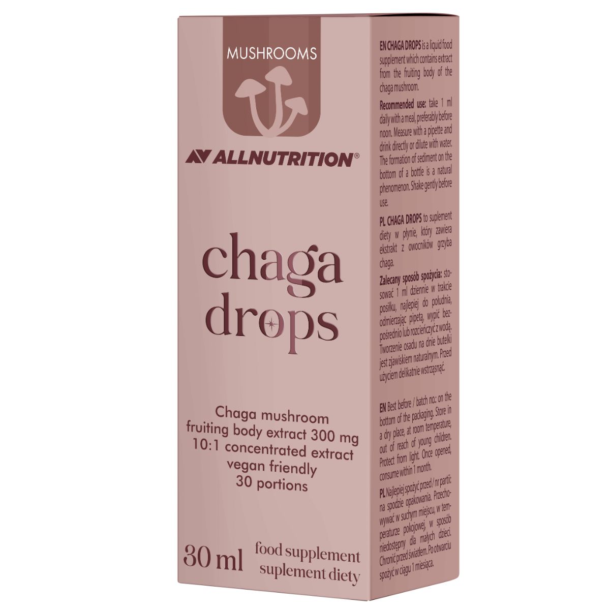 ALLNUTRITION MUSHROOMS CHAGA DROPS to wysokiej jakości suplement diety w formie wygodnych kropli, który dostarcza skoncentrowany ekstrakt z grzyba chaga, czyli błyskoporka podkorowego. Stanowi doskonałe uzupełnienie codziennej diety osób aktywnych, które cenią naturalne składniki i świadomą suplementację.