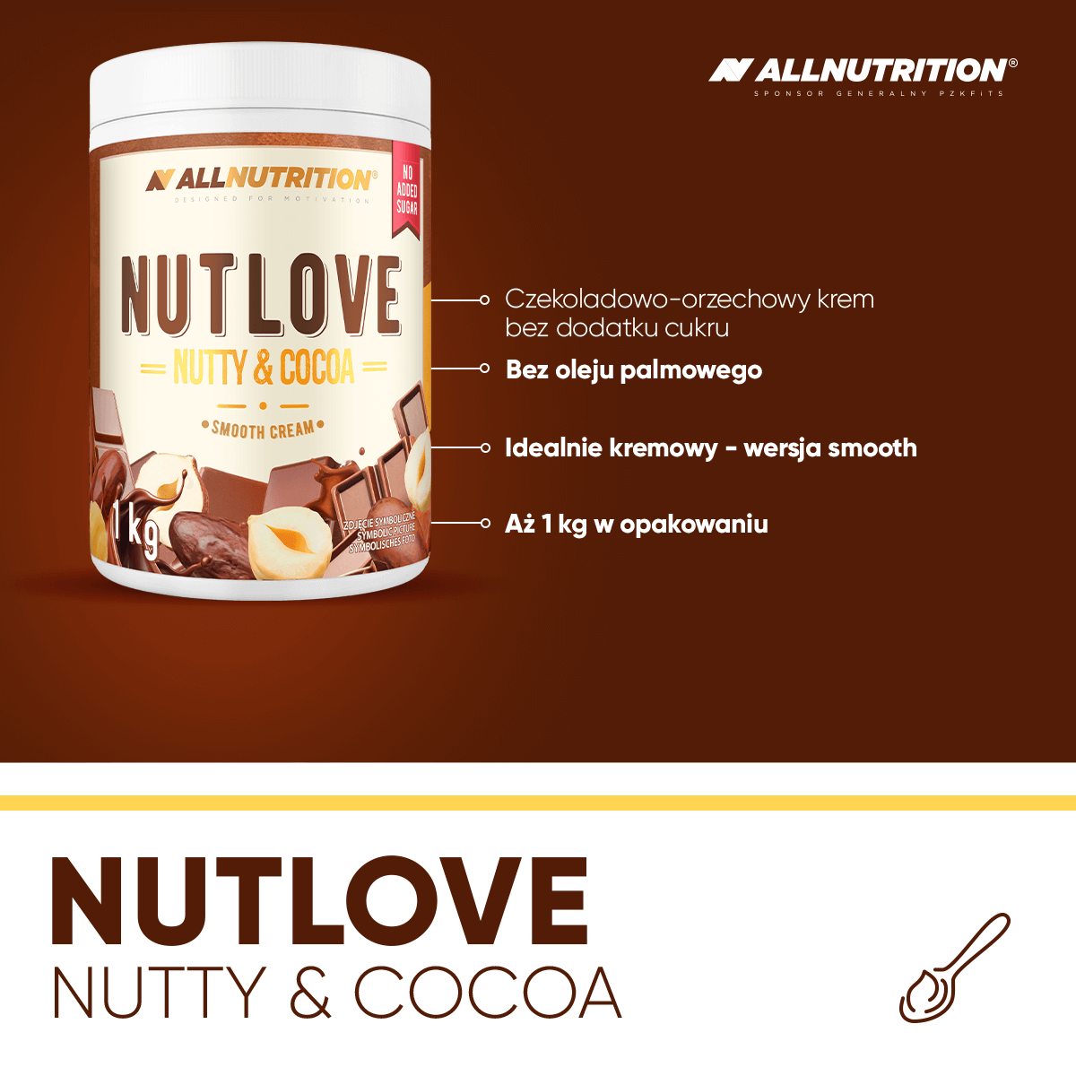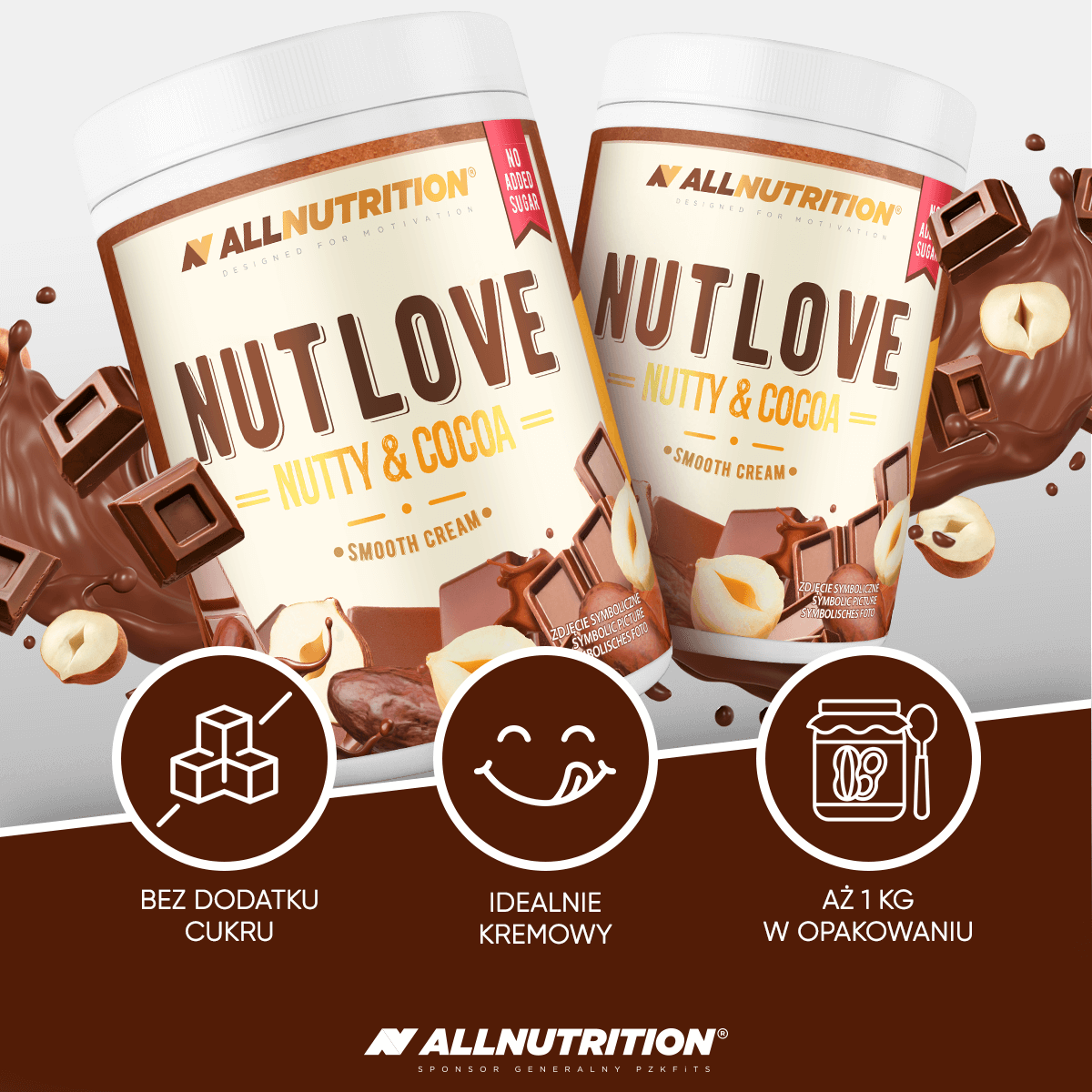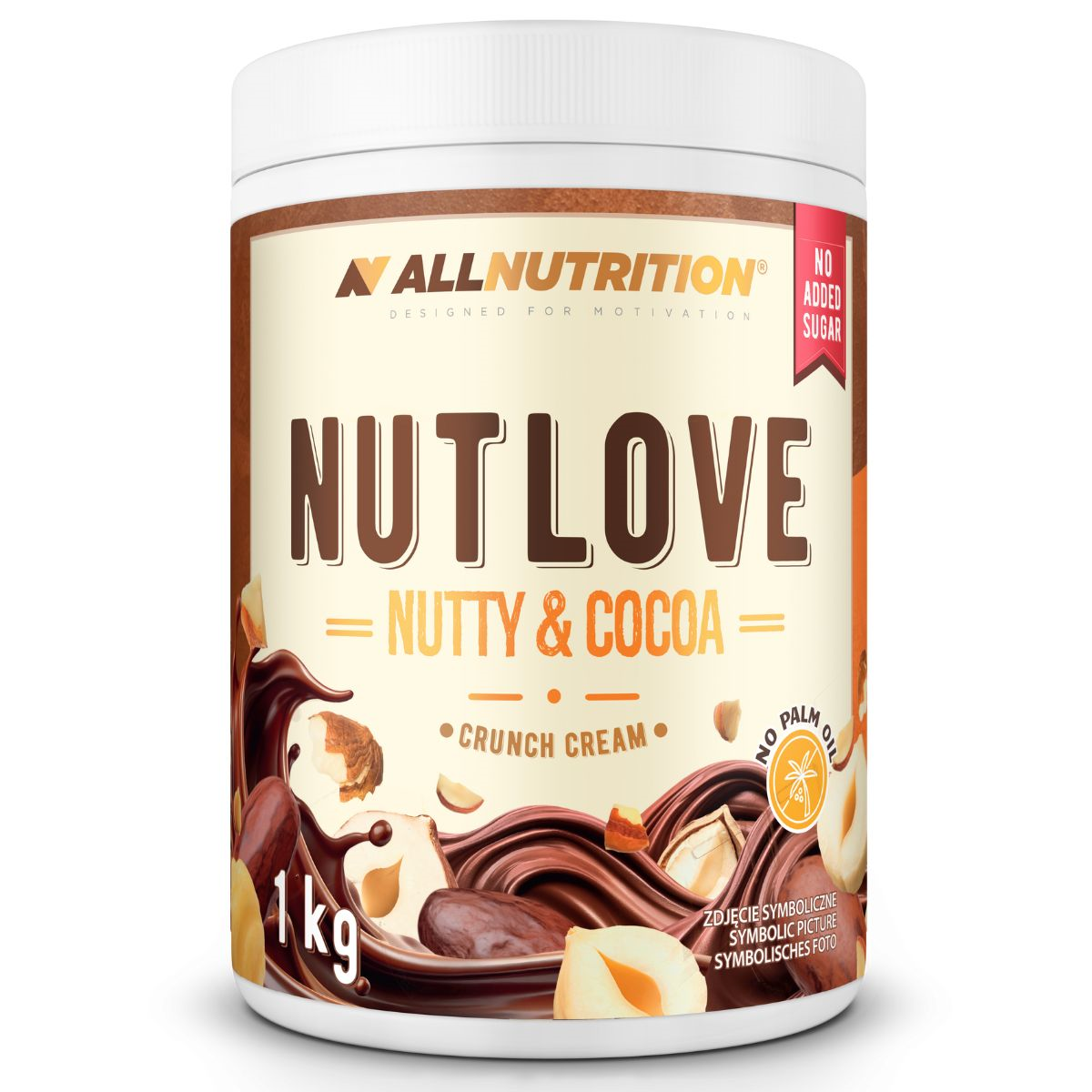 ALLNUTRITION NUTLOVE NUTTY & COCOA to przepyszny krem czekoladowo-orzechowy bez dodatku cukru i oleju palmowego. Wzbogacony o orzechy laskowe w idealnie chrupiącej lub gładkiej wersji. Jest to kolejna odsłona przepysznego kremu, która z pewnością przypadnie Ci do gustu. Teraz, w większym opakowaniu - aż 1 kg!