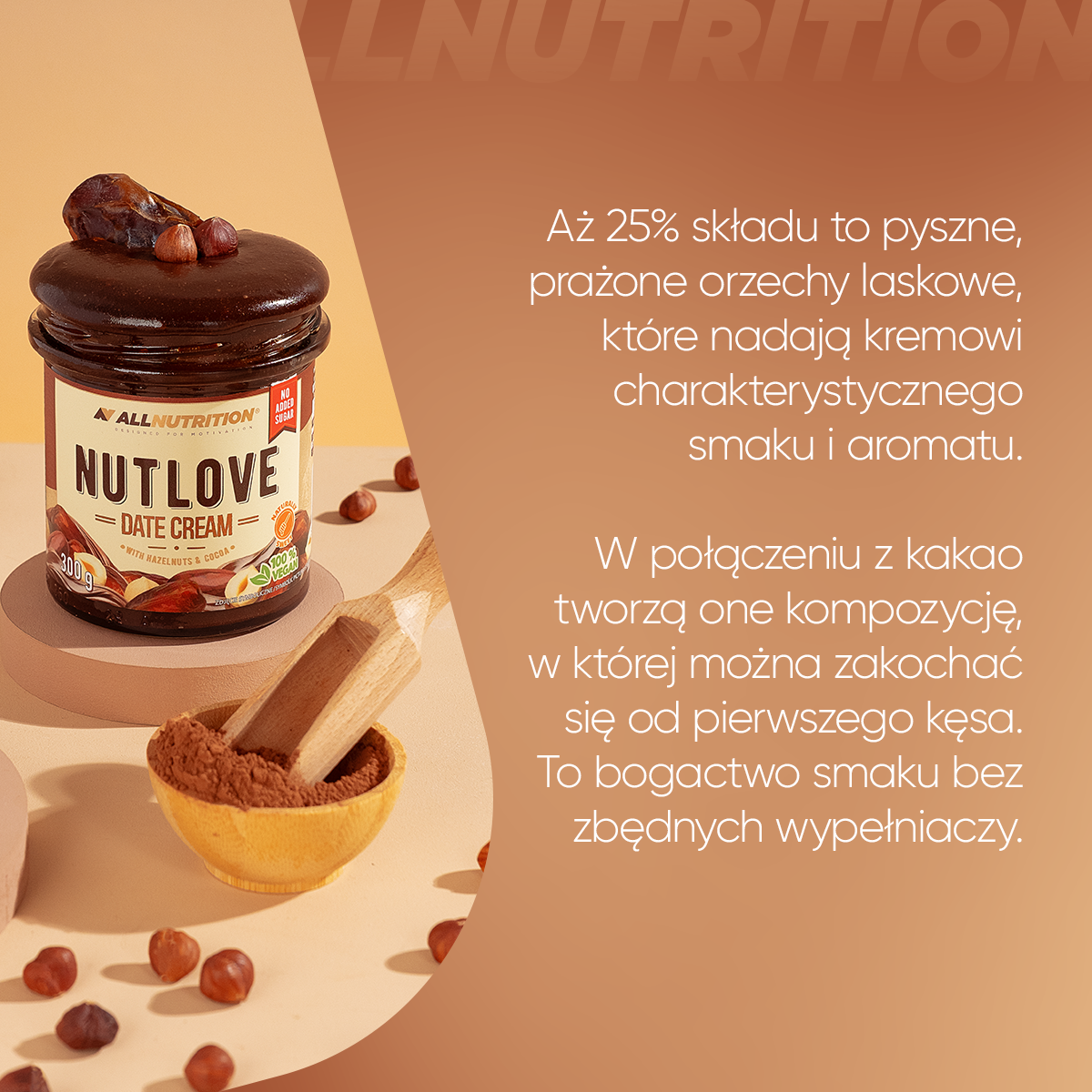 ALLNUTRITION NUTLOVE DATE CREAM to przepyszny, wegański krem daktylowy z orzechami laskowymi i kakao, który jest najlepszym dowodem na to, że w prostocie drzemie największa siła. Stworzony z myślą o osobach, które szukają naturalnej słodyczy i cenią produkty bez dodatku cukru oraz słodzików. To idealny wybór dla każdego fana fit-przekąsek, który chce cieszyć się aksamitną przyjemnością bez żadnych kompromisów!
