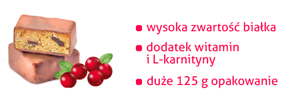 Przykładowy skład: polewa jogurtowa z substancją słodzącą 22% (substancja słodząca: maltitol, w pełni uwodorniony tłuszcz palmowy, serwatka w proszku [z mleka], jogurt w proszku 2% [z mleka], emulgator: lecytyna sojowa, kwas: kwas cytrynowy, aromat), substancja słodząca: maltitol, serwatka w proszku 10% [z mleka], izolat białka sojowego 10%, płatki wytłoczone z pszenicy [gluten] (mąka pszenna pełnoziarnista [gluten], kasza manna [gluten], mąka ryżowa, cukier, sól), składnik żurawinowy 7,5% (żurawina 65%, cukier, olej słonecznikowy, regulator kwasowości: kwas cytrynowy, koncentrat czarnego bzu), substancja zagęszczająca: polidekstroza, olej rzepakowy, substancja utrzymująca wilgoć: glicerol, odtłuszczone mleko w proszku, owoce goji 1,5%, błonnik jabłkowy, węglan wapnia, tłuszcz palmowy, kakao w proszku, emulgator: lecytyna sojowa, L-karnityna, sól, witaminy (witamina C, niacyna, witamina E, kwas pantotenowy, witamina B6, ryboflawina, tiamina, kwas foliowy, biotyna, witamina B12), aromat.